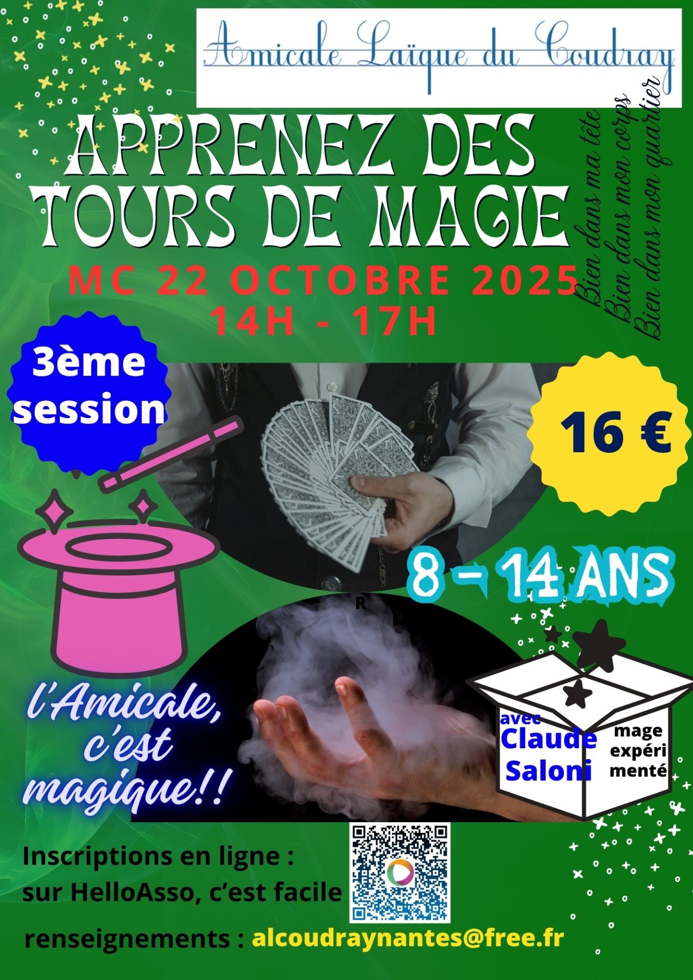 Le lundi 22 octobre 2025, de 14h à 17h, aura lieu un troisième atelier magie, ouverts aux enfants de 8 à 14 ans. Animé par Claude SALONI, mage expérimenté, les enfants apprendront des tours de magie qu'ils pourront à loisir répéter devant leurs parents ou copains.