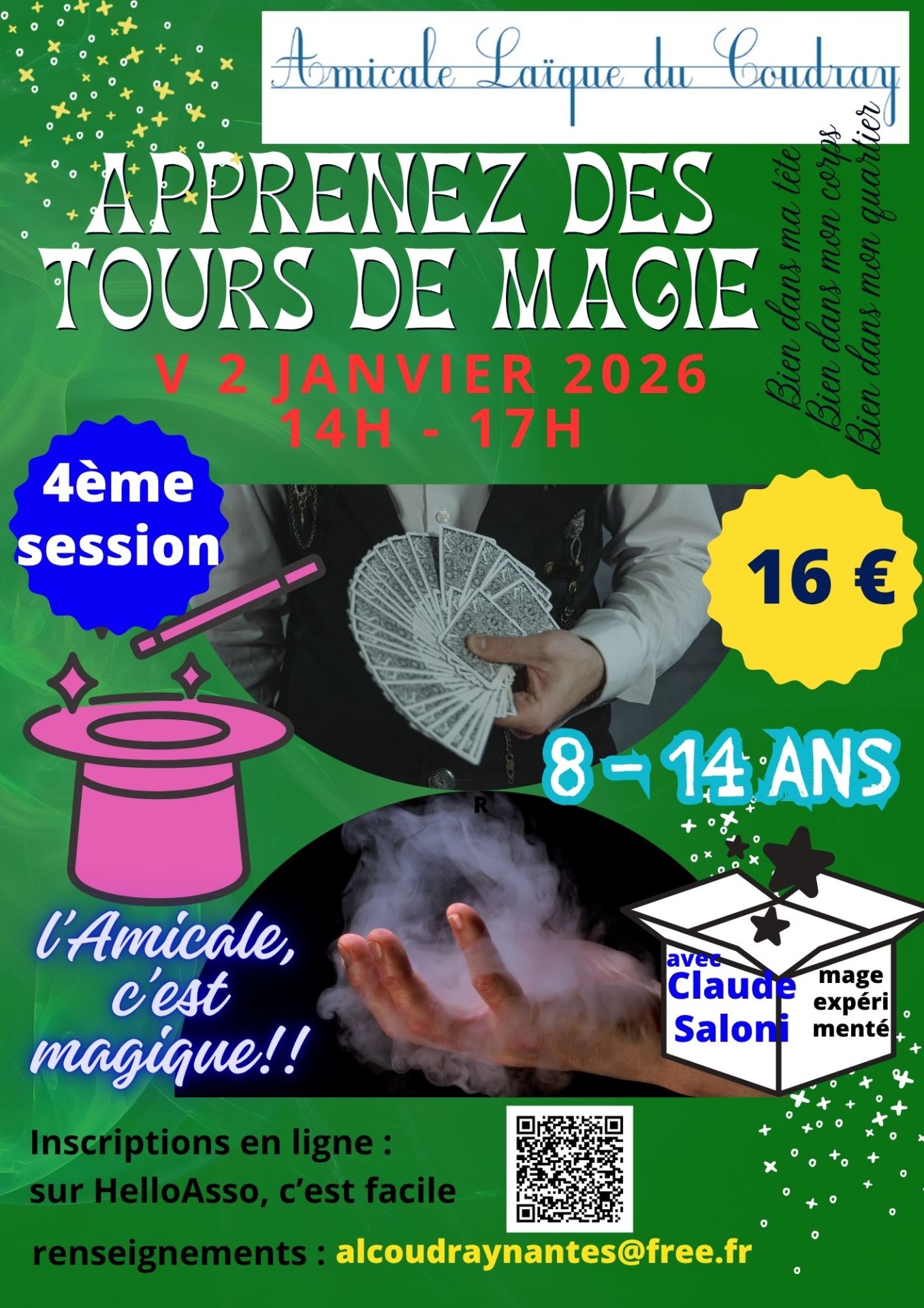 Le vendredi 2 janvier 2026, de 14h à 17h, aura lieu un troisième atelier magie, ouverts aux enfants de 8 à 14 ans. Animé par Claude SALONI, mage expérimenté, les enfants apprendront des tours de magie qu'ils pourront à loisir répéter devant leurs parents ou copains.
